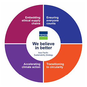 As part of Bunzl Asia Pacific, we are committed to achieving Net Zero for Scope 1 and 2 emissions by 2030, and Net Zero across Scope 1, 2, and 3 by 2050. Our regional Carbon Roadmap outlines the necessary steps to meet these targets. Our Environmental Policy, supported by a certified ISO 14001 environmental management system, demonstrates our commitment to minimising environmental impact through sustainable practices and regulatory compliance.