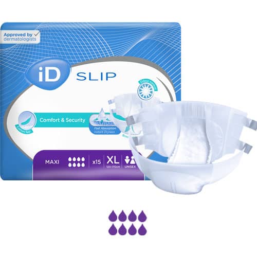 iD Slip range of all -in-one pads are ideal for people with limited mobility with moderate urinary incontinence who experience small losses of fluid and occasional accidents. The iD Slips have high levels of absorption, odour control and anti-leak barriers which gives you total security and comfort. The tabs on either side make the slip easy to apply for you or your carer.