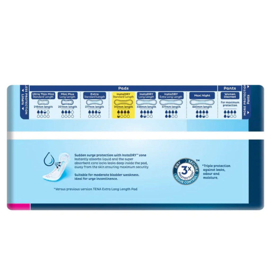 The product is now 20% thinner and is 3cm shorter than before.  It has a new pack design. Tena soft and anatomically shaped Extra Pad providing the ultimate feeling of protection, these comfortable pads offer fast and efficient absorbency. Keeping the individual feeling dry and secure.